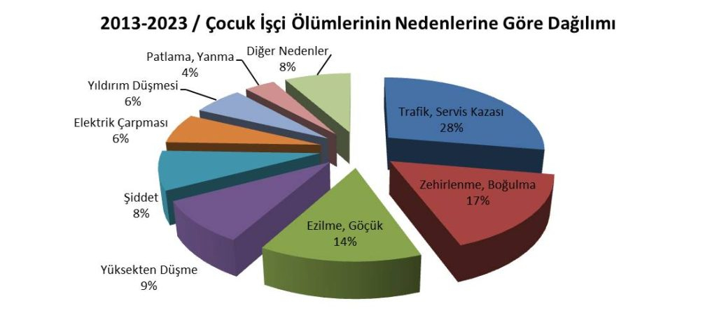 Trafik, Servis Kazası nedeniyle 186 çocuk; Zehirlenme, Boğulma nedeniyle 112 çocuk; Ezilme, Göçük nedeniyle 92 çocuk; Yüksekten Düşme nedeniyle 61 çocuk; Şiddet nedeniyle 56 çocuk; Elektrik Çarpması nedeniyle 44 çocuk; Yıldırım Düşmesi nedeniyle 41 çocuk; Patlama, Yanma nedeniyle 25 çocuk; Kalp Krizi, Beyin Kanaması nedeniyle 14 çocuk; Kesilme, Kopma nedeniyle 13 çocuk; İntihar nedeniyle 9 çocuk; Nesne Çarpması, Düşmesi nedeniyle 8 çocuk; Diğer nedenlerden dolayı 10 çocuk işçi çalışırken hayatını kaybetti…