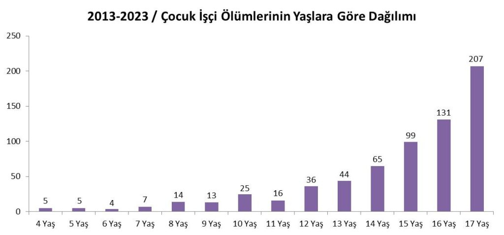 4 yaşında 5 çocuk, 5 yaşında 5 çocuk, 6 yaşında 4 çocuk, 7 yaşında 7 çocuk, 8 yaşında 14 çocuk, 9 yaşında 13 çocuk, 10 yaşında 25 çocuk, 11 yaşında 16 çocuk, 12 yaşında 36 çocuk, 13 yaşında 44 çocuk, 14 yaşında 65 çocuk, 15 yaşında 99 çocuk, 16 yaşında 131 çocuk ve 17 yaşında 207 çocuk işçi çalışırken hayatını kaybetti...