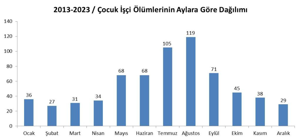 Ocak ayında 36 çocuk, Şubat ayında 27 çocuk, Mart ayında 31 çocuk, Nisan ayında 34 çocuk, Mayıs ayında 68 çocuk, Haziran ayında 68 çocuk, Temmuz ayında 105 çocuk, Ağustos ayında 119 çocuk, Eylül ayında 71 çocuk, Ekim ayında 45 çocuk, Kasım ayında 38 çocuk, Aralık ayında 29 çocuk işçi çalışırken hayatını kaybetti...