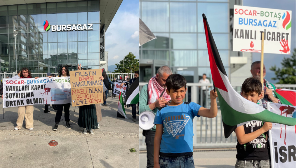 Filistin İçin Bin Genç, Bursagaz önünde basın açıklaması gerçekleştirildi. Ambargo kararı alınmasına rağmen SOCAR ile devam edilen ticari anlaşmayı protesto eden Filistin İçin Bin Genç, vanaların kapatılmasını ve ticari anlaşmaların sona ermesini istedi.