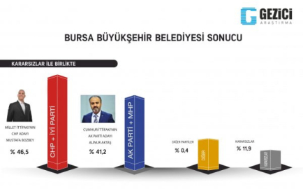 Bursa'da CHP'li Mustafa Bozbey'in, AKP'li Alinur Aktaş karşısında yüzde 46.5 oranında oy aldığı görülüyor. Aktaş'ın oy oranının ise yüzde 41.2 olduğu ifade ediliyor.
