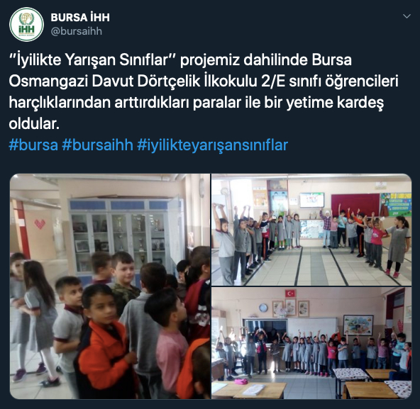 Bursa'da Osmangazi Davut Dörtçelik İlkokulu 2. sınıf öğrencileri sınıflarındaki İHH kumbarasında topladıkları fotoğraflar ile poz verdirildi. Öğrencilerin harçlıklarını kumbaraya atarken çekilen görüntü sosyal medyada servis edildi.