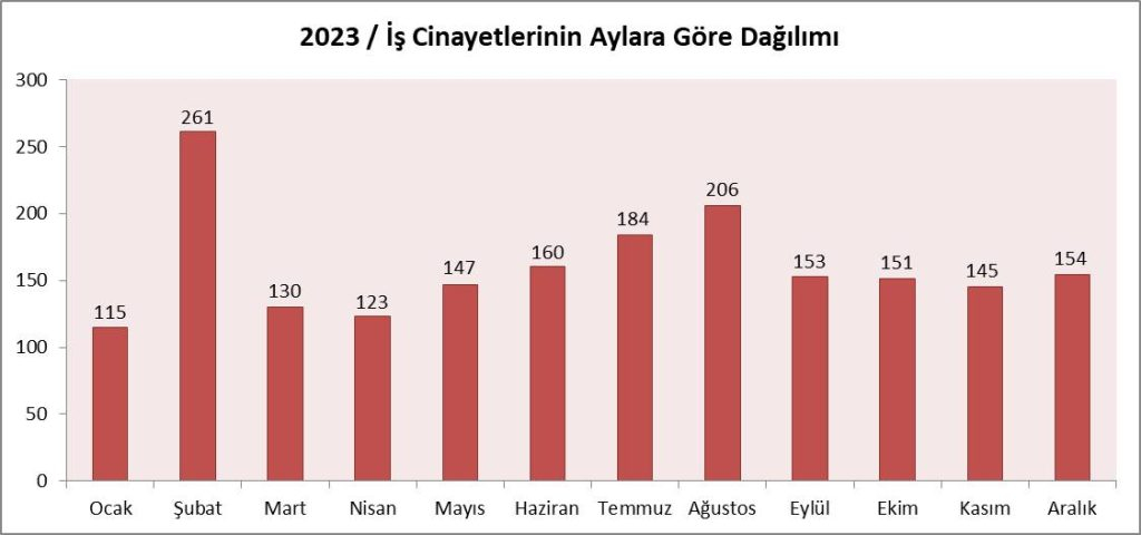 2023 yılında (Ocak’ta 115, Şubat’ta 261, Mart’ta 130, Nisan’da 123, Mayıs’ta 147, Haziran’da 160, Temmuz’da 184, Ağustos’ta 206, Eylül’de 153, Ekim’de 151, Kasım’da 145 ve Aralık’ta 154 olmak üzere) en az 1929 işçi hayatını kaybetti...