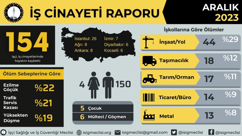 İSİG Meclisi'nin aralık ayı iş cinayetleri raporuna göre, 2023'ün son ayında 154 işçi hayatını kaybetti.