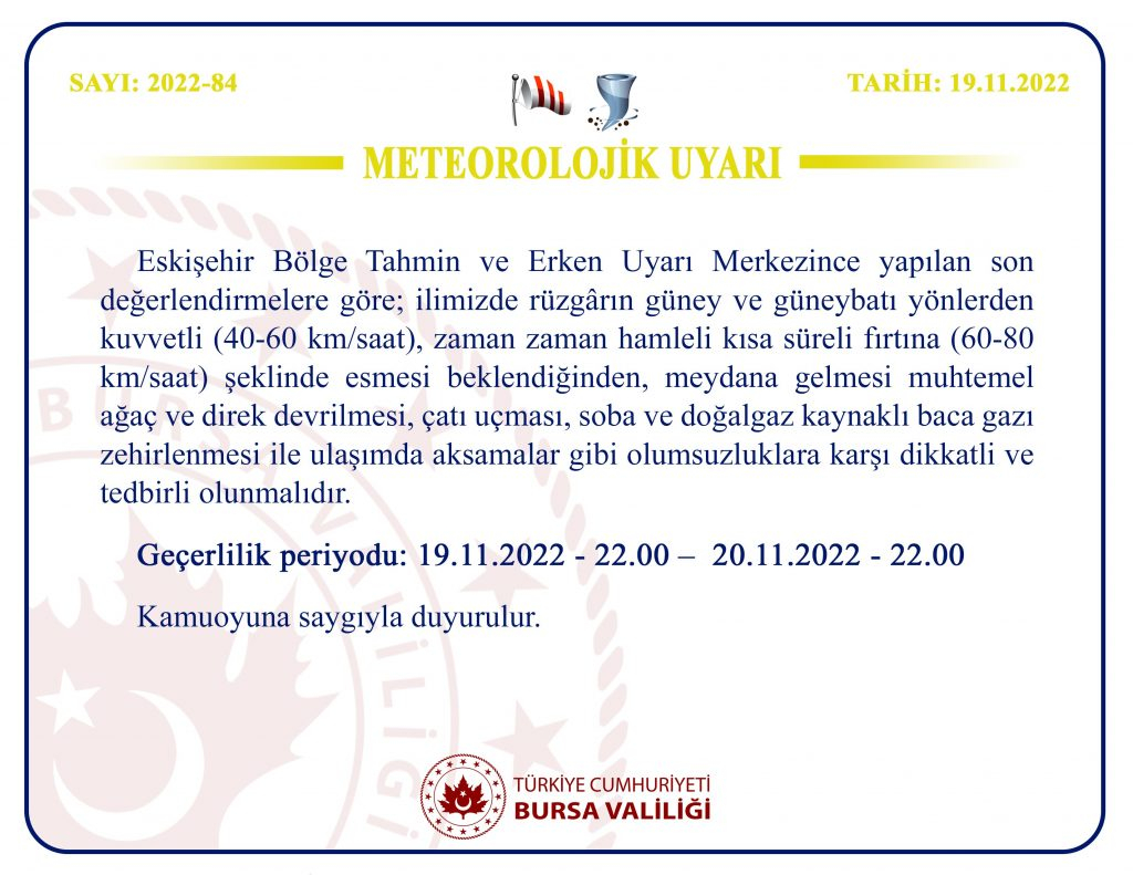 Bugün 22.00’dan başlayıp yarın saat 22.00’a kadar sürmesi beklenen uyarı da şu ifadelere yer verildi: