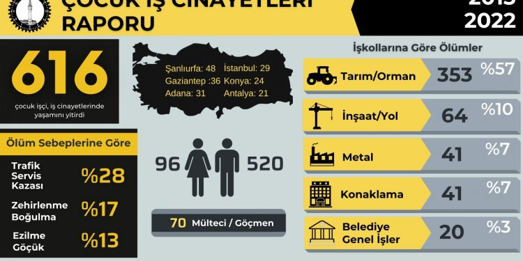 İSİG Meclisi iş cinayetleri raporlarına göre; 2013 yılından bugüne geçen on yılda “en az” 616 çocuk çalışırken hayatını kaybetti. Bu çocukların 96’sı kız 520’si erkek. 4’ü 4 yaşında, 5’i 5 yaşında, 4’ü 6 yaşında, 5’i 7 yaşında, 12’si 8 yaşında, 12’si 9 yaşında, 24’ü 10 yaşında, 13’ü 11 yaşında, 32’si 12 yaşında, 39’u 13 yaşında, 61’i 14 yaşında, 87’si 15 yaşında, 123’ü 16 yaşında ve 195’i 17 yaşında. Bu dönemde toplam 18 bin 683 “iş cinayeti” sonucu ölüm meydana geldi.