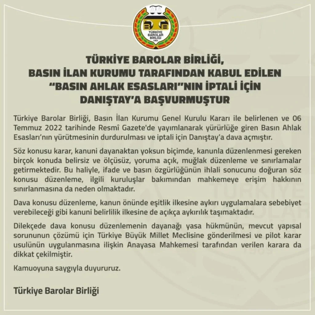 Türkiye Barolar Birliği, Basın İlan Kurumu Genel Kurulu Kararı ile belirlenen ve 6 Temmuz 2022 tarihinde Resmî Gazete'de yayımlanarak yürürlüğe giren Basın Ahlak Esasları’nın yürütmesinin durdurulması ve iptali için Danıştay’a dava açtı.