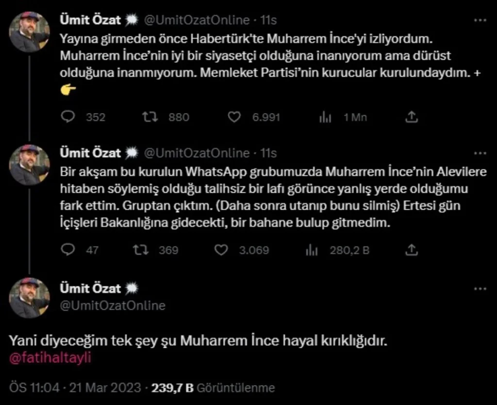 Canlı yayın devam ederken, teknik direktör Ümit Özat, Fatih Altaylı'yı da etiketlediği paylaşımında "WhatsApp grubumuzda Muharrem İnce’nin Alevilere hitaben söylemiş olduğu talihsiz bir lafı görünce yanlış yerde olduğumu fark ettim" ifadelerini kullandı.