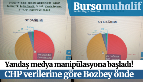 Ana akım medya Bursa oylarını manipüle ederek açıklamaya başladı. Alinur Aktaş'ı yüzde 55, Bozbey'i yüzde 36 olarak gösteren yandaş medyanın verileri CHP'nin seçim sistemiyle uyuşmuyor. CHP'ye gelen verilere göre Bozbey, yüzde 50'ye 44 önde görünüyor.