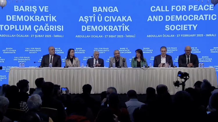 Halkların Eşitlik ve Demokrasi Partisi (DEM Parti) İmralı heyeti bugün üçüncü kez İmralı Cezaevi’nde tutuklu bulunan PKK lideri Abdullah Öcalan ile görüştü. Görüşmeyi tamamlayan imralı heyeti üyeleri Ahmet Türk, Pervin Buldan, Sırrı Süreyya Önder, Tülay Hatimoğulları, Tuncer Bakırhan, Cengiz Çiçek ve Faik Özgür Erol, açıklamanın yapılacağı Elit World Otel'e geldi. Demokratik kitle örgütleri, DEM Parti Milletvekillleri ve Belediye Eş Başkanları, Barış Anneleri ve 300’den fazla gazeteci ve 140 basın kurumu katıldı. Salonda Barış ve Demokratik Toplum Çağrısı yazısı Kürtçe, Türkçe ve İngilizce olmak üzere üç dilde yansıtıldı.