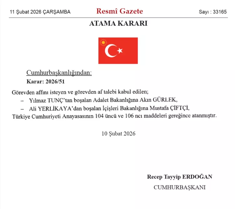 11 Şubat 2026 Çarşamba tarihli Resmî Gazete'de, Cumhurbaşkanı Tayyip Erdoğan'ın imzasıyla yayımlanan karara göre İçişleri Bakanı Ali Yerlikaya ve Adalet Bakanı Yılmaz Tunç görevlerinden alındı. Adalet Bakanı olarak İstanbul Cumhuriyet Başsavcısı Akın Gürlek ve İçişleri Bakanı olarak Erzurum Valisi Mustafa Çiftçi atandı.