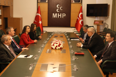 DEM Parti Eş Genel Başkanları Tülay Hatimoğulları ve Tuncer Bakırhan ile DEM Parti TBMM Başkanvekili Sırrı Süreyya Önder ile Grup Başkenvekili Gülistan Kılıç Koçyiğit’in yer aldığı DEM Parti heyeti ile MHP'nin görüşmesi başladı.
