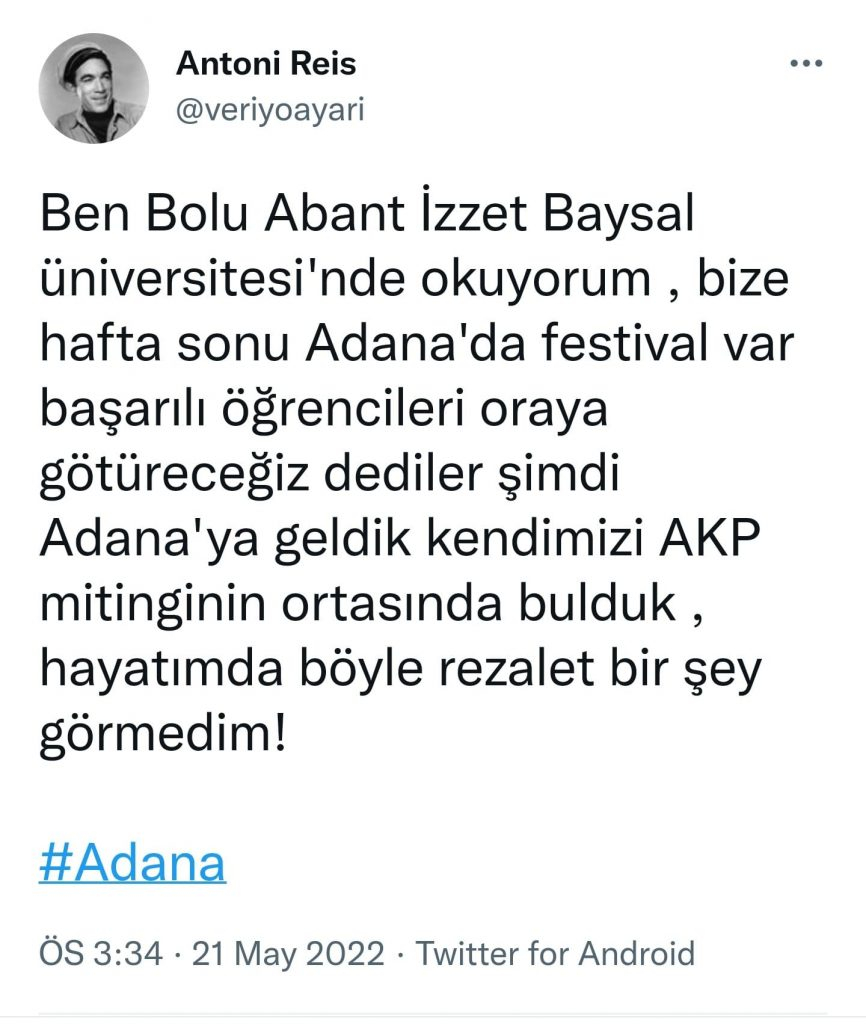 Adana'da 21 Mayıs'ta AKP tarafından düzenlenen festivalin yankıları devam ediyor. Festivale katılanlar sosyal medyada 'kandırıldıklarını' belirten paylaşımlarda bulundu. Bolu Abant İzzet Baysal Üniversitesi'nde öğrenci olan bir kişi, yaptığı paylaşımla, "Bize haftasonunu Adana'da festival var, başarılı öğrencileri götüreceğiz dediler, Adana'ya gittiğimizde kendimizi AKP mitinginin ortasında bulduk, böyle rezalet görmedim" ifadelerini kullandı.