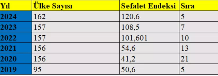 Türkiye’nin endeksteki yükselişi dikkat çekici bir hız sergiliyor. 2023 yılında 108,5 puanla 157 ülke arasında en sefil yedinci ülke konumunda bulunan Türkiye, 2024 verilerinde 120,6 puana yükselerek 162 ülke arasında beşinci sıraya tırmanmış durumda. Bu sıralama, sefaletin geçici bir durum olmaktan çıkarak derinleştiğini ve kalıcılaşma riski taşıdığını gösteriyor.