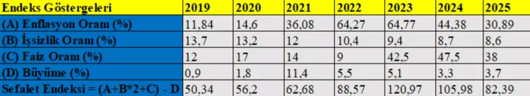 Aşağıdaki tablo, TÜİK tarafından yayımlanan enflasyon, işsizlik ve büyüme verileri ile Investing kaynaklı faiz oranları esas alınarak oluşturulmuştur. 2025 yılına ilişkin büyüme verisi ise gerçekleşme değil, yıl sonu büyüme tahminini yansıtmaktadır.