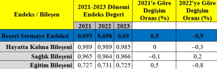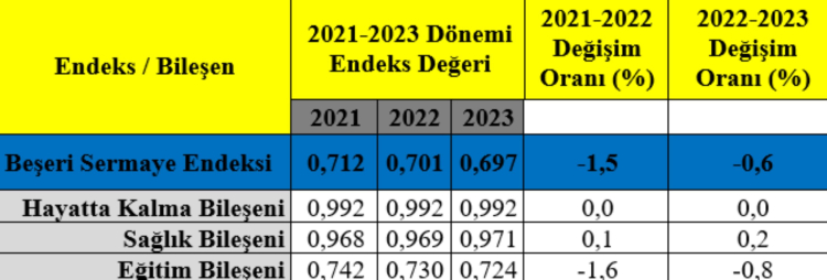 Türkiye’nin beşeri sermaye endeksi aşağıdaki tabloda görüleceği üzere, 2021’de 0,693 iken, 2022’de %0,5 artışla 0,696’ya yükseldi. Ancak 2023’te %0,9’luk düşüşle 0,690’a gerileyerek iyileşme trendini tersine çevirdi. Küçük görünen bu gerilemenin en önemli nedeni, endeksin en belirleyici unsuru olan eğitim bileşenindeki zayıflama oldu.