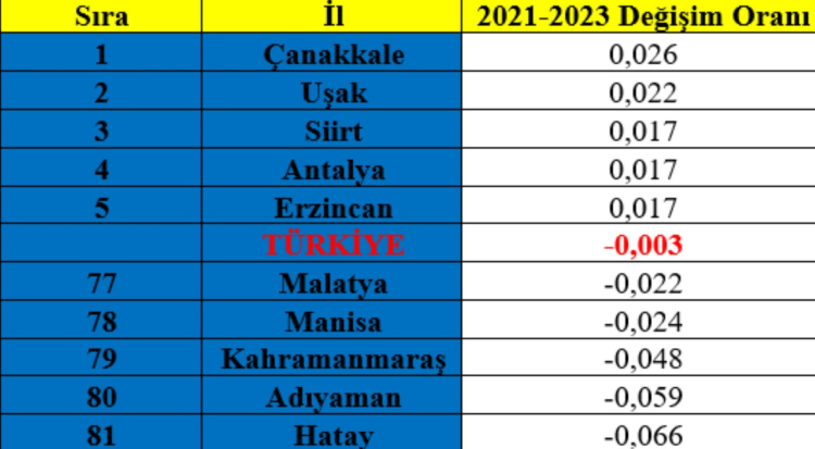 TÜİK raporunun en dikkat çekici bulgusu, şehirler arasındaki büyük uçurum oldu. 2023 verilerine göre Çanakkale, 0,781’lik endeks değeriyle zirvede yer alırken; Antalya (0,761), Erzincan (0,756), Eskişehir (0,755) ve Rize (0,749) onu izledi. Bu şehirler, eğitim ve sağlık alanındaki güçlü performanslarıyla geleceğin nitelikli iş gücünü yetiştirmede örnek gösteriliyor.