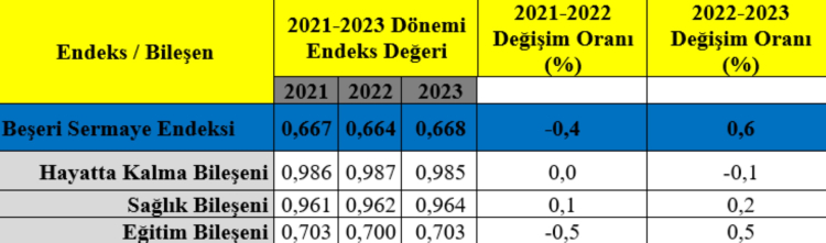 Beşeri sermaye endeksinin 2021-2023 yılları arasında en çok artış gösterdiği ilk beş il ise aşağıdaki tabloda görüleceği üzere sırasıyla 0,026 puan ile Çanakkale, 0,022 puan ile Uşak ve 0,017 puan ile aynı değer artışına sahip Siirt, Antalya, Erzincan olmuştur.