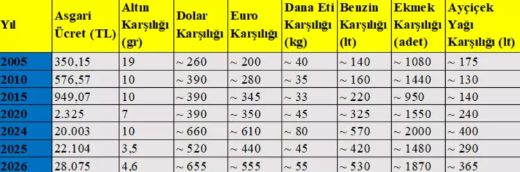 2005–2026 dönemi üzerinden yapılan bu karşılaştırmalar, asgari ücretin bazı yıllarda dolar ve euro cinsinden artmış görünmesine rağmen, gelirinin büyük bölümünü gıda harcamalarına ayırmak zorunda kalan ailelerin gerçek yaşam koşullarında bir iyileşme olduğuna dair yorumların eksik kaldığını göstermektedir. Satın alma gücündeki değişimi esas alan, özellikle gıda başta olmak üzere zorunlu giderlerdeki artışı hesaba katan karşılaştırmalar, dönemler arasındaki asgari ücret farklarını çok daha gerçekçi biçimde ortaya koymaktadır.